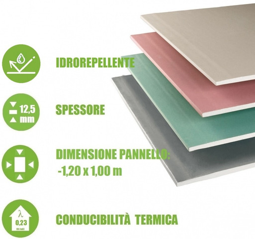 CODICE ARTICOLO: ITALFROM_8631 5 Pannelli in Cartongesso Gypsotech AQUA EH2 - 1,20 m x 1,00 m - Spessore 12,5 mmN.B. PER QUANTITATIVI DIFFERENTI E SUPERIORI AI 5 pz, RICHIEDERE UN PREVENTIVO A: ***************** DESCRIZIONE PRODOTTOLe lastre Gypsotech AQUA tipo EH2 sono composte da uno strato di gesso ( Solfato di Calcio bi-idrato ) additivato con additivi specifici e sostanze idrorepellenti che ne riducono la capacità di assorbimento d'acqua, incorporato fra due fogli di cartone speciale ad alta resistenza.È una lastra ( Tipo EH2 secondo EN 520 ) con ridotta capacità di assorbimento totale d'acqua (inferiore al 10%) e assorbimento superficiale (inferiore a 220 g/mq) specifica per ambienti con parti...