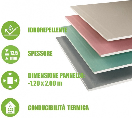 CODICE ARTICOLO: ITALFROM_8632 5 Pannelli in Cartongesso Gypsotech AQUA EH2 - 1,20 m x 2,00 m - Spessore 12,5 mmN.B. PER QUANTITATIVI DIFFERENTI E SUPERIORI AI 5 pz, RICHIEDERE UN PREVENTIVO A: *****************   DESCRIZIONE PRODOTTOLe lastre Gypsotech AQUA tipo EH2 sono composte da uno strato di gesso ( Solfato di Calcio bi-idrato ) additivato con additivi specifici e sostanze idrorepellenti che ne riducono la capacità di assorbimento d'acqua, incorporato fra due fogli di cartone speciale ad alta resistenza.È una lastra ( Tipo EH2 secondo EN 520 ) con ridotta capacità di assorbimento totale d'acqua (inferiore al 10%) e assorbimento superficiale (inferiore a 220 g/mq) specifica per ambienti con pa...