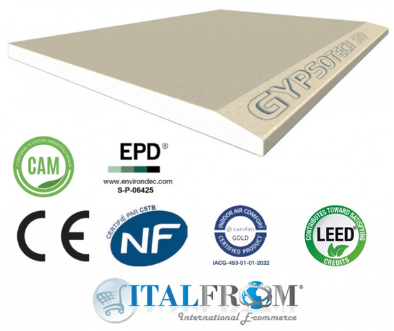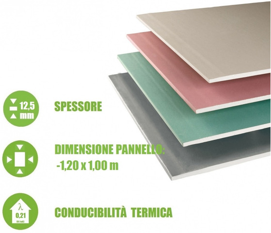 CODICE ARTICOLO: ITALFROM_8661 5 Pannelli in Cartongesso Gypsotech STD Tipo A - 100 x 120 cm - Spessore 12,5 mmN.B. PER QUANTITATIVI DIFFERENTI E SUPERIORI AI 5 pz, RICHIEDERE UN PREVENTIVO A: ***************** DESCRIZIONE PRODOTTOLastra base per normale utilizzo Gypsotech STD (Tipo A secondo EN 520). Strato di gesso ( Solfato di Calcio bi-idrato ) con additivi specifici, incorporato fra due fogli di cartone speciale ad alta resistenza.Nella posa in opera il lato che rimane a vista è costituito da carta di colore avorio.PARAMETRI AMBIENTALIIl cartone, elemento fondamentale delle lastre in cartongesso, è composto dal 100% di carta riciclata. Anche gli additivi utilizzati nella creazione delle lastre sono tutti non tossici o pericolosi.DIMENSIONI PANNELLO100x120x1,25 cm.Ricopre una superficie di 1,20 mqI 5 pannelli ricoprono una superficie totale di 6 mqIMPIEGOUtilizzabili per la formazione di pareti, contropareti e controsoffitti. CARATTERISTICHE TECNICHELe lastre Gypsotech STD, prodotte secondo la normativa EN 520, sono in classe europea di reazione al fuoco A2, s1 - d0.