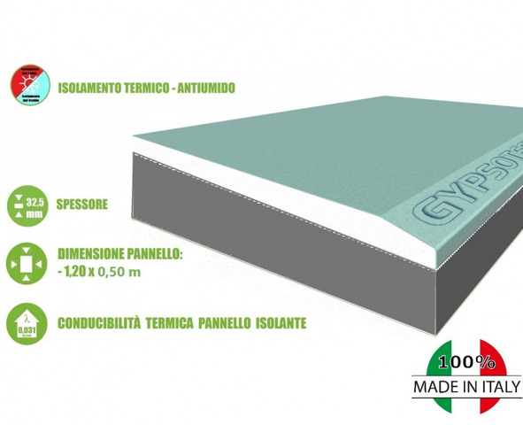 CODICE ARTICOLO: ITALFROM_8648 PANNELLO ACCOPPIATO Cartongesso Gypsotech Aqua e EPS con Grafite 50x120 cm. DESCRIZIONE PRODOTTOI pannelli accoppiati Cartongesso Gypsotech AQUA ed EPS con grafite sono una soluzione ottimale da installare in locali molto umidi in quanto:Le lastre Gypsotech AQUA tipo DEH2 sono composte da uno strato di gesso incorporato fra due fogli di cartone speciale ad alta resistenza. Sono composte da uno strato di gesso additivato con additivi specifici ed idrorepellenti che ne riducono la capacità di assorbimento d'acqua.È una lastra con ridotta capacità di assorbimento totale d'acqua (inferiore al 10%) e assorbimento superficiale (inferiore a 220 g/mq) specifica per ambienti con particolari condizioni igrometriche.Mentre la lastra per isolamento termico in EPS con grafite è prodotta con materie prime di elevata qualità, e ricavata per taglio a filo caldo da blocchi preventivamente stagionati. L'EPS ha un peso molto ridotto poiché è composto dalla maggior parte di aria, questo fa si che risulta facile da posarlo in opera.PARAMETRI AMBIENTALIIl cartone, elemento fondamentale delle lastre in cartongesso, è composto dal 100% di carta riciclata. Anche gli additivi utilizzati nella creazione delle lastre sono tutti non tossici o pericolosi.L'EPS anche se è un materiale sintetizzato, è al 100% riciclabile e atossico. Le lastre sono utilizzate per l'isolamento termico degli edifici in quanto risulta determinante per il risparmio energetico, questo implica un minor costo per la climatizzazione invernale ed estiva.DIMENSIONI PANNELLO50x120x3,25 cm.IMPIEGOUtilizzabili per la formazione di pareti, contropareti e controsoffitti. CARATTERISTICHE TECNICHELe lastre Gypsotech AQUA, prodotte secondo la normativa EN 520, sono in classe europea di reazione al fuoco A2, s1 - d0.Strato isolante costituito da pannelli di Polistirene Espanso Sinterizzato - EPS 100 kPa, da inserire in intercapedini, piani di soffitta, sottotetti, contro-soffitti, cappoti interni ed esterni. Dalla tabella è possibile notare il valore molto basso della conducibilità termica 'lambda' pari a 0,031 W/(mK), ciò fa si che l'EPS con grafite è un ottimo materiale isolate!!!