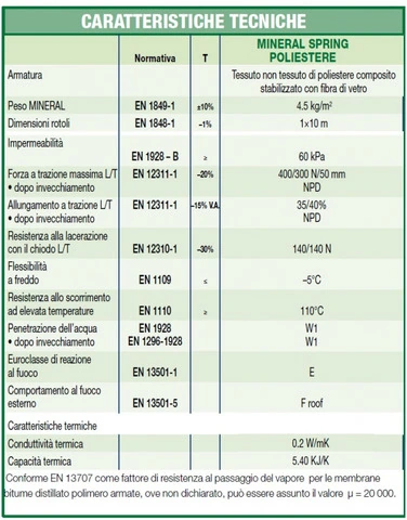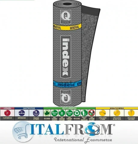 CODICE ARTICOLO: ITALFROM_8427 GUAINA IMPERMEABILE BITUMINOSA ROSSA - MINERAL SPRING- 4,5 kg/m² DESCRIZIONELa membrana MINERAL SPRING è costituita da bitume distillato e selezionato per l’uso industriale, additivato con un elevato tenore di polimeri plastomerici poliolefinici tali da ottenere una lega ad “inversione di fase” la cui fase continua è formata da polimero nel quale è disperso il bitume, dove le caratteristiche sono determinate dalla matrice polimerica e non dal bitume anche se questo ne costituisce l’ingrediente maggioritario. Le prestazioni del bitume vengono pertanto incrementate e risulta migliorata la durabilità e la resistenza alle alte e basse temperature mantenendo inalterate le già ottime qualità di adesività e di impermeabilità del bitume. MINERAL SPRING POLIESTERE è prodotta in varie grammature con armature in tessuto non tessuto di poliestere stabilizzato. MINERAL SPRING POLIESTERE è armata con un composito in “tessuto non tessuto” di poliestere imputrescibile stabilizzato con fibra di vetro, di elevata resistenza meccanica ed elasticità e dotato di una ottima stabilità dimensionale a caldo che riduce i problemi di sciabolatura dei teli e di ritiro delle giunzioni di testa, perché è da 2 a 3 volte più stabile delle normali armature in tessuto non tessuto di poliestere. La membrana MINERAL SPRING ha la faccia superiore autoprotetta con scagliette di ardesia, di colori diversi, incollate e pressate a caldo. Solamente una striscia laterale di sovrapposizione priva di ardesia e protetta con una fascia di film Flamina che va fusa a fiamma per saldare la giunzione. La faccia inferiore della membrana è rivestita con Flamina, un film plastico fusibile, ed è goffrata sia per ottenere la pretensione e quindi l’ottimale retrazione del film, che per offrire alla fiamma una maggior superficie e quindi una posa più sicura e più veloce. Quando la membrana è applicata a secco o per punti, la goffratura funge da diffusore di vapore.DIMENSIONE ROTOLOH1X10mCAMPI D'IMPIEGOLe durevoli caratteristiche di resistenza meccanica e di elasticità e la stabilità sia ad alta che bassa temperatura della membrana MINERAL SPRING consentono di impiegarle in climi non particolarmente freddi come elemento di tenuta, sia per lavori nuovi che per rifacimenti: • Su tutte le pendenze, sia in piano che in verticale e su superfici curve. • Su piani di posa di diversa natura: piani di posa cementizi gettati in opera o prefabbricati, su coperture in legno, sui più diffusi isolanti termici usati in edilizia. • MINERAL SPRING è destinato all’impermeabilizzazione sotto copertura discontinua e viene impiegato come membrana sottotegola. SCHEDA TECNICAPARTICOLARI COSTRUTTIVI DELLA MEMBRANA