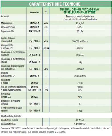 CODICE ARTICOLO: ITALFROM_8449 MEMBRANA IMPERMEABILIZZANTE AUTOADESIVA PER COPERTURE - MINERAL DESIGN DESCRIZIONEMINERAL DESIGN AUTOADESIVO è la nuova versione di MINERAL DESIGN che si incolla per autoadesione, è la stessa membrana che ha la faccia inferiore spalmata con una speciale mescola elastomerica autoadesiva per semplice pressione a temperatura ambiente, che è costituita da una particolare miscela di bitume venezuelano selezionato, resine tackificanti e polimeri elastomerici termoplastici radiali e lineari dalle capacità adesive durevoli nel tempo. Dal grafico è possibile notare come la mescola adesiva di MINERAL DESIGN AUTOADESIVO, al contrario di una mescola autoadesiva a base di bitumi standard, mantenga inalterata l’adesività durante il test di stoccaggio e, nel grafico successivo, come la particolare formulazione con additivi “antifreeze” che la contraddistingue le consenta di mantenere una buona adesività anche a bassa temperatura durante il test di adesione a freddo.MINERAL DESIGN AUTOADESIVO EP SELFLAPS POLIESTERE è una membrana in cui la cimosa è autoadesiva e può essere saldata senza l’utilizzo della fiamma. È destinata unicamente alla posa su tavolato di legno e su superfici di limitate proporzioni, inferiori a 200 m2. Per stabilizzare ulteriormente la zona del sormonto e limitare le tensioni che potrebbero sollecitarlo si è ritenuto opportuno produrre MINERAL DESIGN AUTOADESIVO EP SELFLAPS POLIESTERE con un bordo sabbiato di 3 cm ca. per consentire un fissaggio meccanico con chiodi o cambre prima di asportare la fascia protettiva siliconata della cimosa autoadesiva e di sigillare la sovrapposizione.DIMENSIONE ROTOLOH1X10mMODALITÀ D'IMPIEGOI teli di MINERAL DESIGN AUTOADESIVO EP SELFLAPS POLIESTERE vanno posati con le stesse modalità della versione OVERLAPS e vengono fissati ogni 10÷15 cm sul sormonto longitudinale con chiodi a testa larga di 1 cm di diametro o con la cambratrice. Su pendenze superiori al 15% le misure e il fissaggio meccanico in testa ai teli sarà dello stesso tipo del caso precedente. La saldatura dei sormonti longitudinali avverrà per autoadesione badando di pressare accuratamente con un rullino mentre la saldatura dei sormonti di testa verrà eseguita impiegando l’adesivo a freddo HEADCOLL. SCHEDA TECNICA