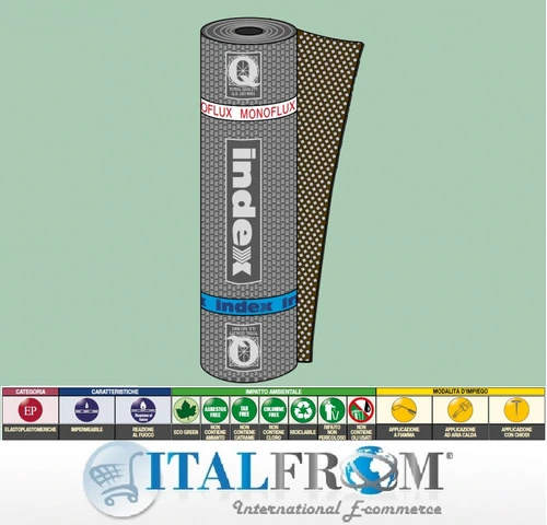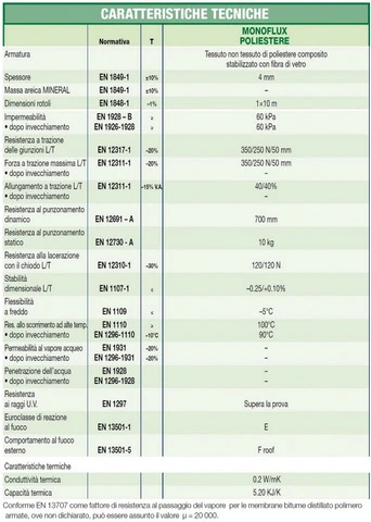 CODICE ARTICOLO: ITALFROM_8425 GUAINA IMPERMEABILE BITUMINOSA - MONOFLUX POLIESTERE - SPESSORE 4mm DESCRIZIONELe membrane MONOFLUX sono costituite da bitume distillato e selezionato per l’uso industriale additivato con polimeri elastomerici e plastomerici tali da ottenere una lega ad “inversione di fase” la cui fase continua è formata da polimero nel quale è disperso il bitume, dove le caratteristiche sono determinate dalla matrice polimerica e non dal bitume anche se questo ne costituisce l’ingrediente maggioritario. Le prestazioni del bitume vengono pertanto incrementate e risulta migliorata la durabilità e la resistenza alle alte e basse temperature mantenendo inalterate le già ottime qualità di adesività e di impermeabilità del bitume. MONOFLUX POLIESTERE è armata con un composito in “tessuto non tessuto” di poliestere imputrescibile stabilizzato con fibra di vetro, di elevata resistenza meccanica ed elasticità e dotato di una ottima stabilità dimensionale a caldo che riduce i problemi di sciabolatura dei teli e di ritiro delle giunzioni di testa, perché è da 2 a 3 volte più stabile delle normali armature in tessuto non tessuto di poliestere. Le membrane MONOFLUX POLIESTERE hanno la faccia superiore rivestita con talco fine serigrafato, omogeneamente distribuito, un trattamento brevettato che consente un agevole svolgimento delle spire dei rotoli unito ad una sicura e veloce saldatura delle giunzioni. DIMENSIONE ROTOLOH1X10mCAMPI D'IMPIEGOLe durevoli caratteristiche di resistenza meccanica e di elasticità e la stabilità sia ad alta che bassa temperatura della membrana MONOFLUX POLIESTERE consentono di impiegarla, in climi non particolarmente freddi, come elemento di tenuta, sia per lavori nuovi che per rifacimenti in edilizia: • Su tutte le pendenze: sia in piano che in verticale e su superfici curve;• Su piani di posa di diversa natura: piani di posa cementizi gettati in opera o prefabbricati, su coperture in legno, sui più diffusi isolanti termici usati in edilizia; • Per le più disparate destinazioni d’uso: tetti piani ed inclinati, rivestimenti dielettrici, muri controterra.SCHEDA TECNICAPARTICOLARI COSTRUTTIVI DELLA MEMBRANA