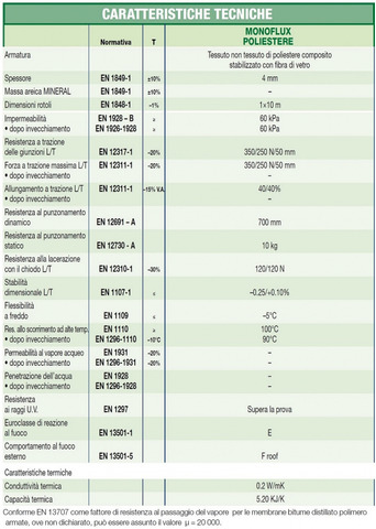 CODICE ARTICOLO: ITALFROM_8425 GUAINA IMPERMEABILE BITUMINOSA - MONOFLUX POLIESTERE - SPESSORE 4mm DESCRIZIONELe membrane MONOFLUX sono costituite da bitume distillato e selezionato per l’uso industriale additivato con polimeri elastomerici e plastomerici tali da ottenere una lega ad “inversione di fase” la cui fase continua è formata da polimero nel quale è disperso il bitume, dove le caratteristiche sono determinate dalla matrice polimerica e non dal bitume anche se questo ne costituisce l’ingrediente maggioritario. Le prestazioni del bitume vengono pertanto incrementate e risulta migliorata la durabilità e la resistenza alle alte e basse temperature mantenendo inalterate le già ottime qualità di adesività e di impermeabilità del bitume. MONOFLUX POLIESTERE è armata con un composito in “tessuto non tessuto” di poliestere imputrescibile stabilizzato con fibra di vetro, di elevata resistenza meccanica ed elasticità e dotato di una ottima stabilità dimensionale a caldo che riduce i problemi di sciabolatura dei teli e di ritiro delle giunzioni di testa, perché è da 2 a 3 volte più stabile delle normali armature in tessuto non tessuto di poliestere. Le membrane MONOFLUX POLIESTERE hanno la faccia superiore rivestita con talco fine serigrafato, omogeneamente distribuito, un trattamento brevettato che consente un agevole svolgimento delle spire dei rotoli unito ad una sicura e veloce saldatura delle giunzioni. DIMENSIONE ROTOLOH1X10mCAMPI D'IMPIEGOLe durevoli caratteristiche di resistenza meccanica e di elasticità e la stabilità sia ad alta che bassa temperatura della membrana MONOFLUX POLIESTERE consentono di impiegarla, in climi non particolarmente freddi, come elemento di tenuta, sia per lavori nuovi che per rifacimenti in edilizia: • Su tutte le pendenze: sia in piano che in verticale e su superfici curve;• Su piani di posa di diversa natura: piani di posa cementizi gettati in opera o prefabbricati, su coperture in legno, sui più diffusi isolanti termici usati in edilizia; • Per le più disparate destinazioni d’uso: tetti piani ed inclinati, rivestimenti dielettrici, muri controterra.SCHEDA TECNICAPARTICOLARI COSTRUTTIVI DELLA MEMBRANA