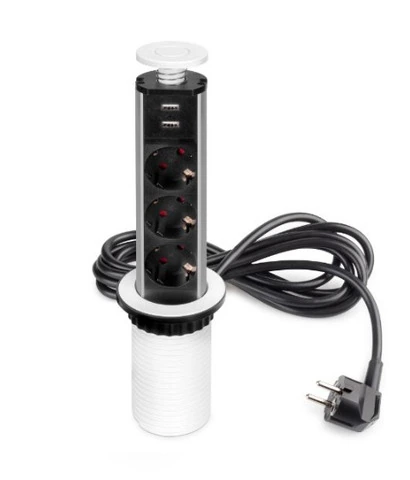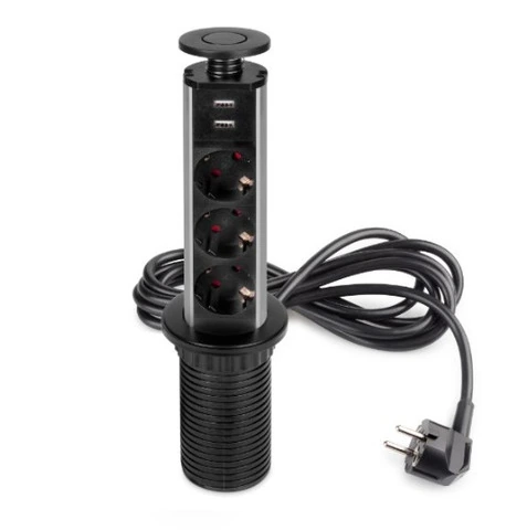 Multiconnettore estraibileCaratteristiche del prodotto Multipresa da incasso per mobili della casa e dell'ufficio. Pensato per essere incassato tanto nei moduli alti che in quelli bassi. Dispone di un movimento retrattile con facile estrazione e occultamento manuale. Dispone di 3 prese tipo Schuko con una potenza massima ammissibile fino a 3500W – 16A. Ha anche 2 connettori USB A e 1 connettore USB C, con funzione di ricarica rapida e un campo di applicazione di 5 V-3 A, 9 V-2 A, 12 V-1,5 A per USB A e 5 V-3 A, 9 V -2 A, 12 V -1,67 A per USB C. Per la sua istallazione si richiede di un foro D. 60mm. Ha la possibilità di essere montato in superfici di grande spessore, tra 1 e 95 mm. Si fissa al mobile senza neccessità di ferrammenta grazie a un bullone di fissaggio manuale. Possiede un indicatore LED di accensione. Inoltre dispone di un cavo di alimentazione di 1,8 mt con presa 230V AC 50Hz. Disponibile in 3 colori: Nero, Bianco e Grigio Informazioni sul prodotto Connettore multipresa o torretta di prese estraibile, progettato per apportare funzionalità con la sua completa integrazione nell'arredo per la casa e dell'ufficio. E' pensato per essere incassato tanto nei moduli alti come in quelli bassi grazie al suo design di facile estrazione e occultazione manuale. Si adatta perfettamenteo alle scrivanie già provviste di passacavi. Dispone di tre prese tipo Schuko con una potenza massima ammissibile fino a 3500W – 16A e di due connettori USB per caricare dispositivi elettrici 5V DC (1 x 1A / 2 x 0,5A) ideale per caricare smartphone e tablet. La sua istallazione è molto versatile, richiede solo un foro D. 60 mm ed ha la possibilità di essere montato in superfici di grande spessore, tra 1 e 95 mm. Inoltre si fissa al mobile senza necessità di ferramenta grazie a una bussola di fissaggio manuale. Dispone di un discreto indicatore LED di accensione e un cavo di 1,8 mt con presa per il funzionamento a 230V AC 50Hz.