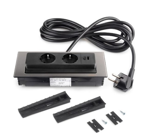 Multiconnettore In Acciaio Inossidabile Caratteristiche del prodotto Connettore ad incasso con sicurezza per bambini integrata. Dispone di 2 prese di tipo Schuko con una potenza massima ammissibile fino a 3600W - 16A. Dotato di una porta USB tipo A che permette la ricarica veloce di un dispositivo fino a 2.10A con potenza massima 5W. Comprende un cavo di collegamento di 3 m con connettore angolare con presa 230V AC 50Hz. Viene montato su una lavorazione di 88x215 mm, per spessori tra 10 e 40 mm. à fabbricato in finitura in acciaio inossidabile.Informazioni sul prodotto Base multipresa con un'elegante finitura in acciaio inox che permette una completa integrazione a incasso nei mobili di cucina, ufficio e casa. Il suo design innovativo mantiene le prese nascoste quando non sono in uso e con un leggero tocco è girevole per accedere alle prese. Questa multipresa è dotata di una sicurezza bambini integrata, due prese di tipo F Schuko (EU) con una potenza massima ammissibile fino a 3600W-16A e una porta USB tipo A che permette la ricarica veloce di un dispositivo fino a 2,10A con potenza massima di 5W. Include anche un cavo di collegamento con una spina angolare di 3 metri con presa 230V AC 50Hz. La sua installazione è molto versatile, richiede solo una lavorazione di 88x215 mm, per spessori tra 10 e 40 mm e si fissa al mobile montando le piastre di montaggio. Può essere installato ovunque, anche sopra i cassetti, perché richiede solo una profondità di 53 mm.