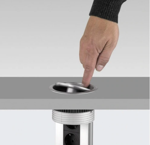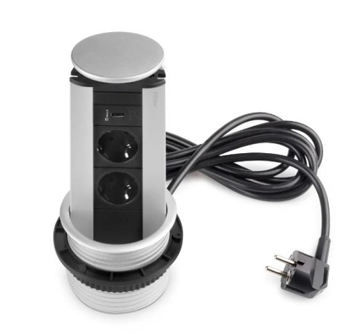 Multiconnettore Port USBCaratteristiche del prodotto Connettore per l'incasso in mobili per ufficio e casa, con sicurezza per bambini integrata. Dispone di due prese di tipo Schuko con una potenza massima ammissibile fino a 3600W - 16A. Dotato di una porta USB tipo A che permette la ricarica veloce di un dispositivo fino a 2.10A con potenza massima 5W. Comprende un cavo di collegamento di 3 m con connettore angolare con spina 230V AC 50Hz. Si monta su lavorazioni di diametro 102mm, su superfici di grande spessore, tra 1 e 80 mm. È prodotto in una finitura anodizzata opaca. Informazione sul prodotto Connettore multipresa o torre di prese progettato per avere sempre prese accessibili delle prese di corrente in cucina, in ufficio e nei mobili di casa. È ideale per essere incassato in moduli bassi o alti, grazie al suo design retrattile per una facile estrazione e occultamento manuale. Dispone di un coperchio oscillante che serve come presa per estrarre il multiconnettore e anche come protezione per evitare che i cavi si deformino. Questa multipresa dispone di una sicurezza bambini integrata, due prese di tipo F Schuko (EU) con una potenza massima ammissibile fino a 3600W-16A e una porta USB tipo A che permette la ricarica veloce di un dispositivo fino a 2,10A, con una potenza massima di 5W. Inoltre include un cavo di collegamento di 3 m con spina angolare con presa 230V AC 50Hz. La sua installazione è molto versatile, in quanto richiede solo un foro di 102 mm di diametro, in superfici con uno spessore compreso tra 1 e 80 mm. Si fissa anche ai mobili senza bisogno di attrezzi grazie a un dado di fissaggio manuale.