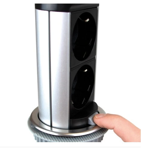 Multiconnettore VertikalCaratteristiche del prodotto Multipresa da incasso per mobili della casa e dell'ufficio. Destinato per il mercato europeo EU. Dispone di due prese tipo Schuko con una potenza massima ammissibile fino a 3680W – 16A. Inoltre possiede 2 connettori USB 5V DC per ricaricare veloce smartphone o tablet (1 x 2,4A / 2 x 1,2A) con potenza massima di 12W. Accesso ai connettori USB premendo sulla superficie. Per la sua istallazione si richiede di un foro D. 60mm. Si fissa al mobile senza neccessità di ferrammenta grazie a un bullone di fissaggio manuale. Ha la possibilità di essere montato in superfici di grande spessore, tra 1 e 60 mm. Inoltre dispone di un cavo di alimentazione di 1,5 mt con presa 230V AC 50Hz. Prodotto in acciaio finitura inox e plastica nera. INFORMAZIONI SUL PRODOTTO  Multipresa ritrattile da incasso pensata per avere sempre a disposizione una presa di corrente e i connettori USB integrati nel mobile grazie al suo disegno ritrattile di estrazione e occultamento manuale. Tutti i multiconnettori restano completamente nascosti quando non vengono utilizzati. Questo connettore dispone di due prese elettriche tipo F schuko (EU) con una potenza massima ammissibile fino a 3680W - 16A e due connettori USB per la ricarica veloce di dispositivi elettronici 5V DC (1 x 2,4A / 2 x 1,2A) con una potenza massima di 12W. Per utilizzare i connettori USB è sufficiente una leggera pressione sulla superficie in acciaio inossidabile, che li rende entrambi accessibili. Se poi devi utilizzare le prese di corrente, puoi tirare il blocco verso l’alto per renderle accessibili. La sua installazione è molto versatile in quanto richiede solo un foro di diametro 60mm (si adatta perfettamente alle scrivanie già dotate di passacavi da 60mm) e può essere montato su superfici di grande spessore, tra 1 e 60 mm. Inoltre si fissa ai mobili senza bisogno di attrezzi grazie a una bussola di bloccaggio manuale. Ha inoltre di un cavo di 1,5 m con spina per il suo funzionamento a 230V AC 50Hz e con protezione IP20.