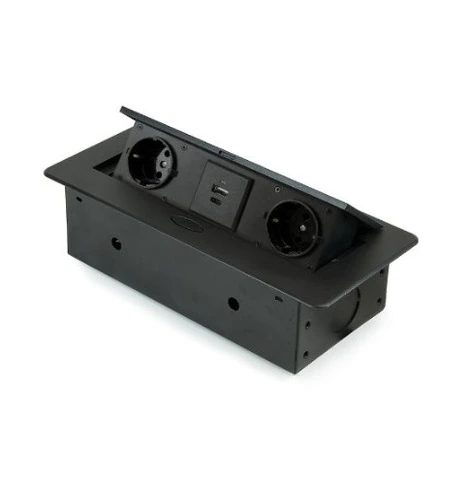 Multipresa per scrivania Nero-Bianco-GrigioCaratteristiche del prodotto Dispone di due spine tipo F Schuko (EU) con una potenza massima ammissibile fino a 3.000 W - 13 A, e due connettori USB tipo A e tipo C 5 V CC (1 x 1 A / 2 x 0,5 A). Incorpora un coperchio di sollevamento automatico a pulsante per un facile accesso ai connettori e un discreto indicatore di alimentazione a LED. Include un cavo da 1,5 m con spina per il funzionamento a 230V AC 50Hz. Richiede lavorazione sulla tavola 225x111mm. Il mobile viene fissato con le staffe e le viti comprese nella fornitura. Disponibile in 3 colori: Nero, Bianco e Grigio INFORMAZIONI SUL PRODOTTO La ciabatta per scrivania o tavolo da conferenza, è ideale anche per i mobili di casa accanto alla TV. Il suo design permette una completa integrazione ad incasso nel mobile grazie alla sua finitura verniciata bianca, nera o grigia. Dispone di due spine tipo F Schuko (UE) con una potenza massima ammissibile fino a 3.000 W - 13 A e due connettori USB tipo A e tipo C per carica dispositivi elettronici 5V DC (1 x 1A / 2 x 0,5A). È dotato di un pulsante, coperchio auto sollevante per un facile accesso ai connettori e un discreto indicatore di alimentazione a LED. La sua installazione è molto versatile poiché include un cavo da 1,5 m con spina per il suo funzionamento a 230V AC 50Hz. Richiede lavorazione nella scheda 225x111mm e consente il montaggio su superfici spesse, un massimo di 36 mm. Il mobile viene fissato con le staffe e le viti comprese nella fornitura.