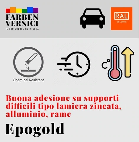 EPOGOLD Smalto Epossidico ALTO SOLIDOResistente Ad Agenti Chimici E Alte Temperature - Semilucido 5KG/25KGSmalto epossidico ALTO SOLIDO di buona resistenza agli agenti chimici, alle alte temperature e di buona adesione su supporti difficili tipo lamiera zincata, alluminio, rame, ecc., ottimo per verniciature industriali non esposte all’esterno e adatto anche per cemento e calcestruzzo.A differenza di molte vernici epossidiche essica rapidamente (3-4 ore).La versione lucida si catalizza in peso al 35% versioni semilucide al 25% con ns. EPOHART 20, e quelle bucciate al 20%, sempre in peso con ns. GOFFREY EPOX.TABELLA RALE' possibile ordinare diverse varianti di colore indicando il codice Ral presente in tabella.TINTE FORTI: SOVRAPPEZZO DI EURO 1.00/KG
